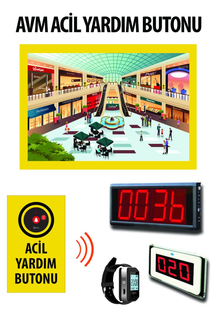 AVM ziyaretçilerinin, çalışan personelin sağlık ve güvenlik problemleri oluşması durumunda acil yardım butonlarına basarak en kısa sürede gerekli personelin ihtiyaç sahibine ulaşması sağlanmaktadır.