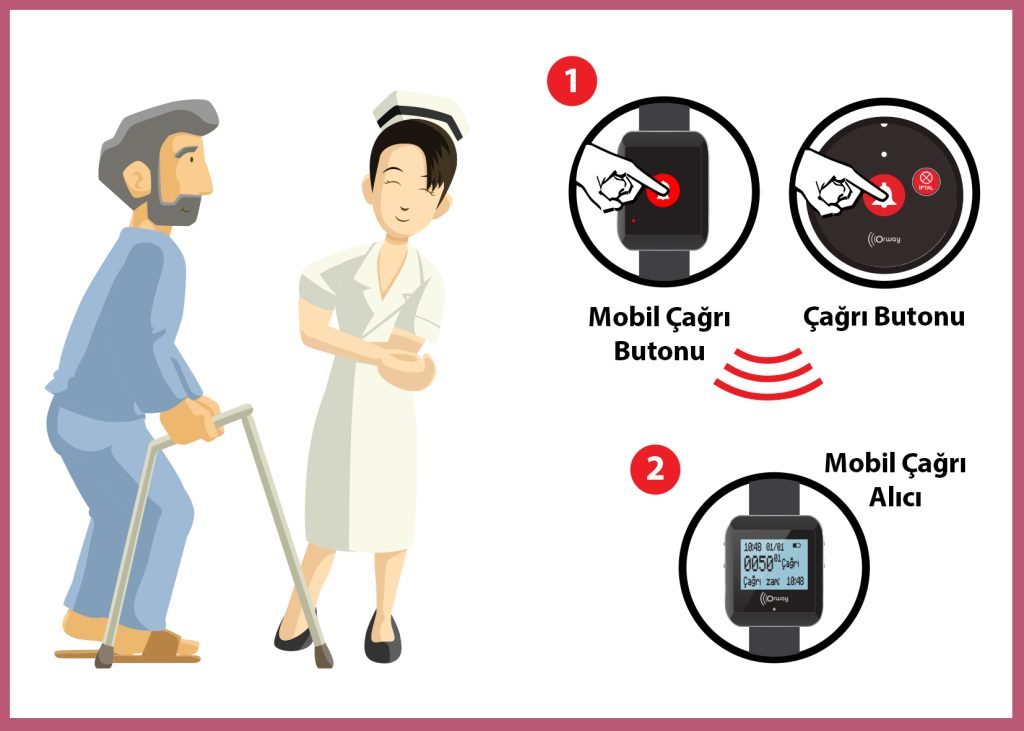 Yardıma muhtaç hasta / yaşlının bileğinde taşıdığı saat ya da boyunda taşınabilen kolye tipi yardım butonu (OSB 1) aracılığı ile çağrı tuşuna basarak, bakıcı / yardımcının bileğinde veya boynunda taşıdığı kolye tipi alıcıya (OS 5) gelen titreşim, ses ve ışıklı uyarı sayesinde odaya hızla gelmesi sağlanır.