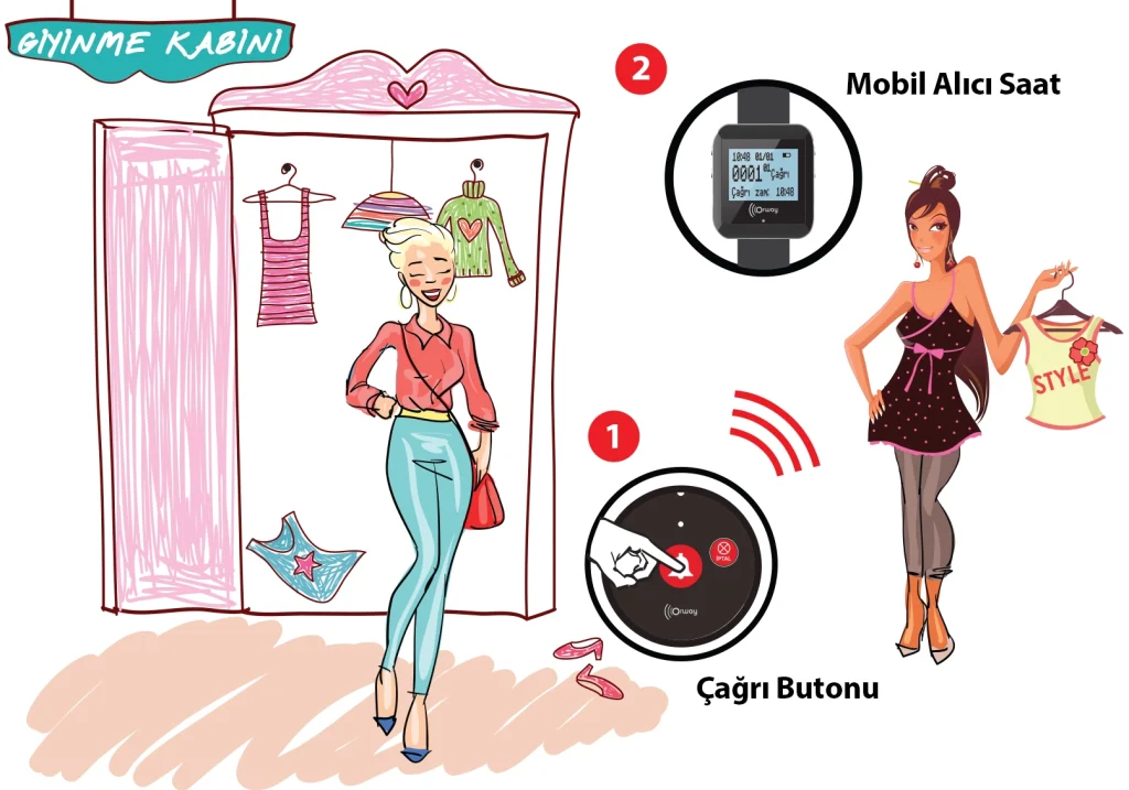 Perakende satış mağazaları, alışveriş noktaları vb. bir çok yerde yaşanan en büyük problem müşterilerin kıyafet değişimlerinde defalarca kıyafet değiştirmeleri ve bunu sonucunda büyük zaman kaybı ve müşteri için büyük sorun oluşturmaktadır. Ürün desteği almak istediklerinde reyon görevlisine ulaşmada yaşanan sorunlar göze çarpmaktadır. Bu gibi durumlarda müşteri memnuniyetsizliği yaşanmakla birlikte, işletme markası olumsuz etkilenmekte ve bazen maddi anlamda da kayıplar oluşmaktadır. Bu ve benzeri sorunların çözümü için kablosuz mağaza reyon görevlisi çağırma sistemi ile müşterilerinizin istedikleri anda reyon görevlisine ulaşması sağlanmaktadır. Çağrı butonları sayesinde müşteri memnuniyeti azami seviyede tutulurken, reyon görevlisinin performansı da pozitif yönde etkilenmiş ve çalışma performansı da kontrol altına alınmış olacaktır.