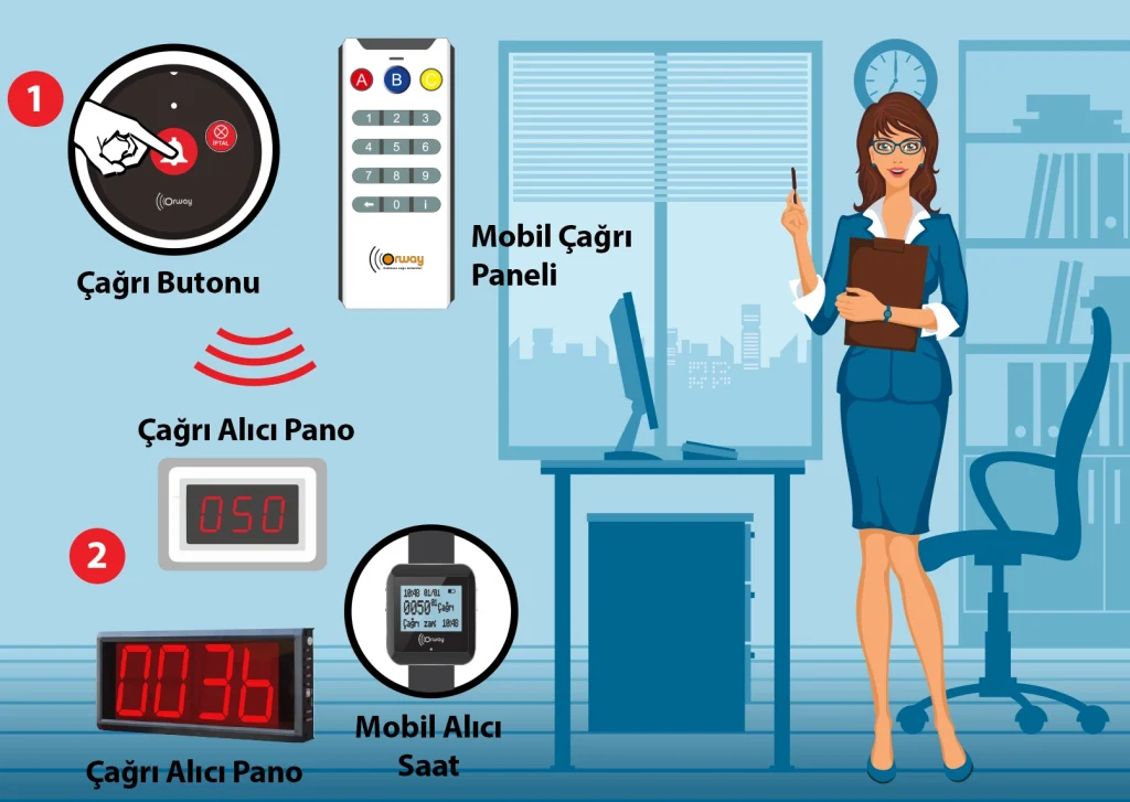 Çağrı yapılacak noktalara konulan butonlar sayesinde hizmet desteği almak istediğinde butondaki “ZİL” (OB 2) işaretine basarak görevliye çağrı yapar, çağrıyı alan hizmet görevlisi kolunda takılı Mobil saat Alıcı sistemi (OS 5 )sayesinde bulunduğu noktadan gelen çağrı sinyalini titreşimle kolunda hissederek hizmet noktasına hızla giderek çağrı yapanın taleplerine cevap verir.