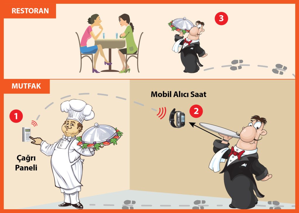 Kablosuz Restaurant Mutfak Çağrı Sistemleri; Restoran, Cafe, Bar, Çay Bahçeleri, Nargile Salonları, Otel ve tatil köylerinde, müşteri memnuniyetini arttırmak ve servis hizmetlerinin en üst seviyede sunulmasını sağlamak amacı ile tasarlanmış ve üretilmiştir. Bu sistem ile siparişler hazır olduğunda mutfaktaki şef, servis yapan garsonlara direk çağrı göndererek siparişin hazır olduğunu bildirir ve hızlı bir şekilde masaya servis edilmesini sağlar.